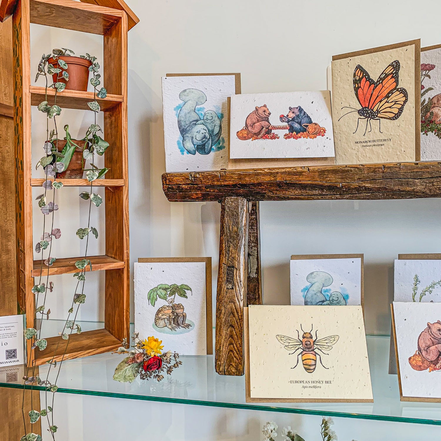 Their designs feature natural elements including flora and fauna and are printed onto seeded paper that can actually be planted afterwards to grow wildflower & herbs. The company is staunchly focused on their commitment to environmental stewardship and donates 10% of their profits to various ecological organizations. As of 2021, they have been able to donate over $18,000 to organizations that support Native Land conservation, biological diversity, pollinators, and more.