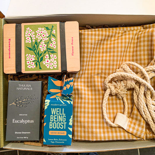 All gift boxes and components (tissue paper, filler, stickers) are recyclable and/or compostable so you can be sure that the gift you're giving is as well thought out as the products inside.