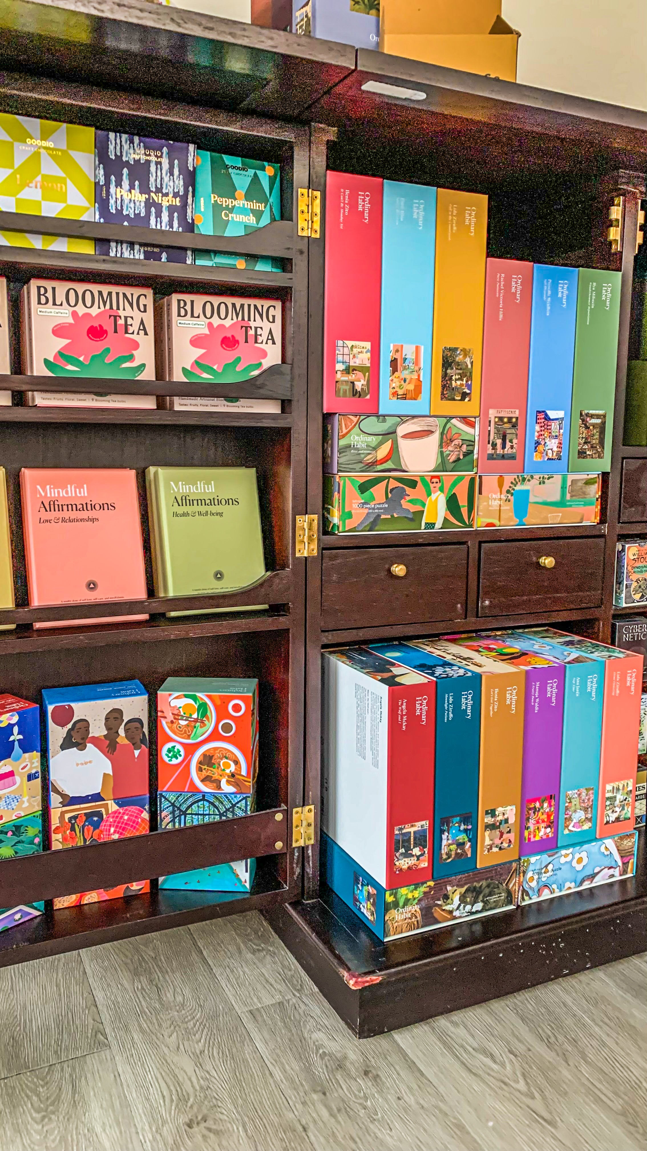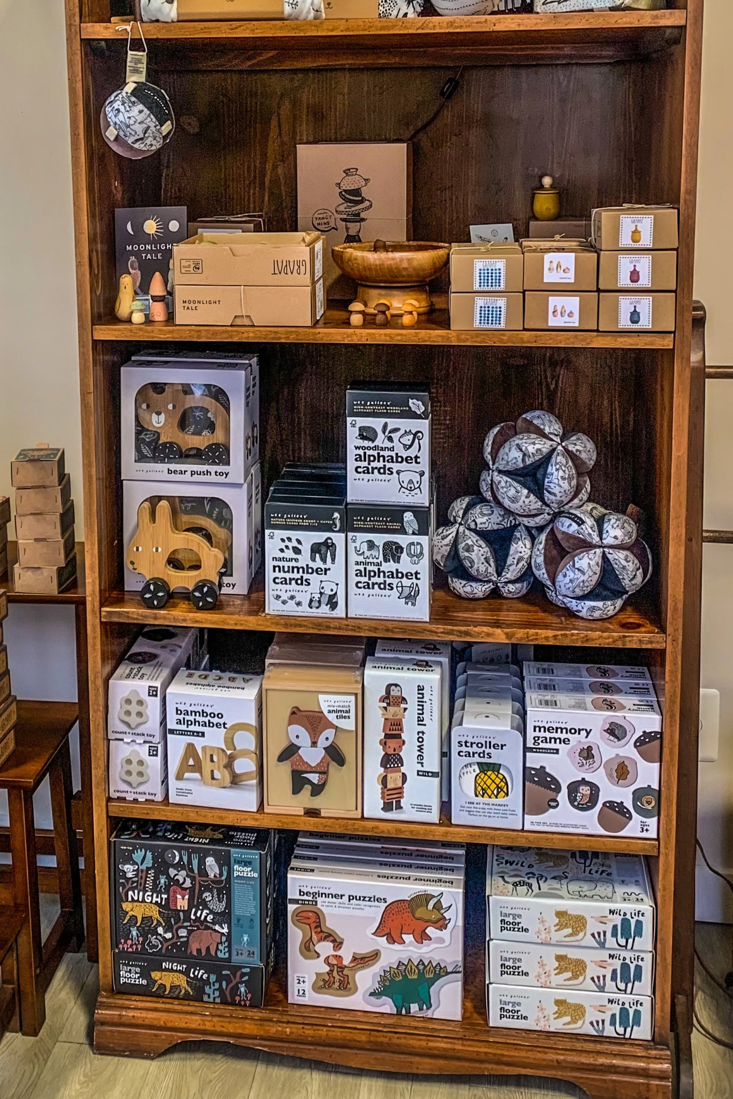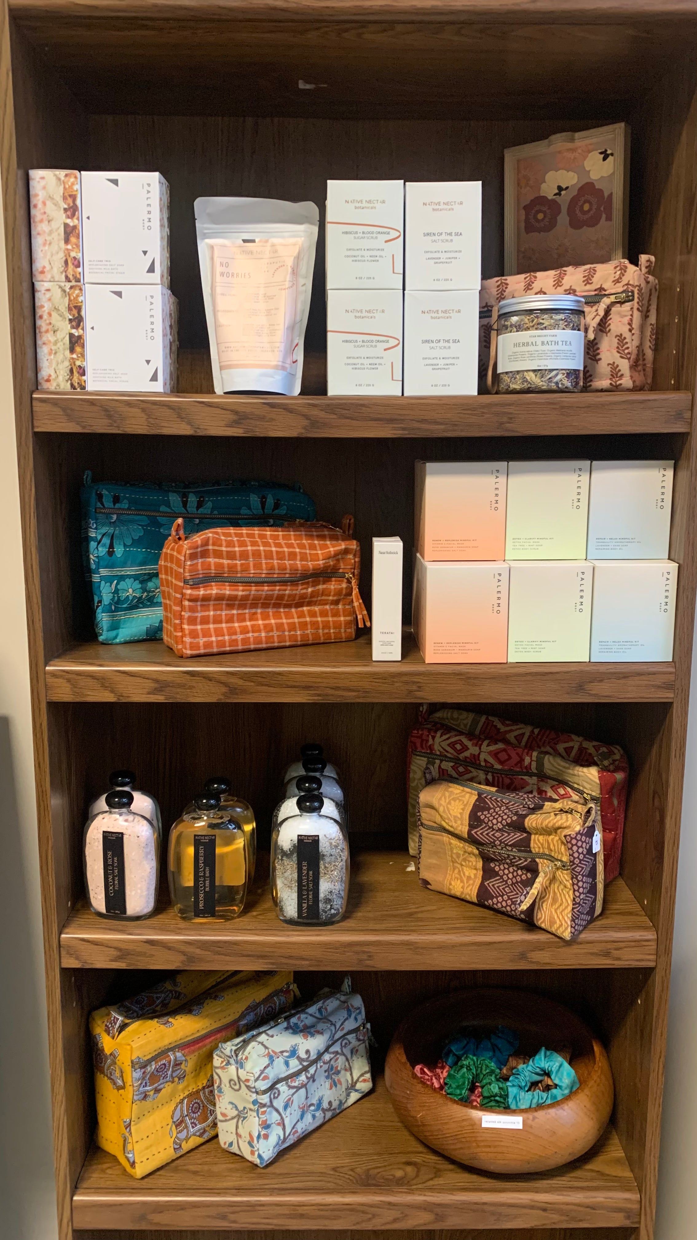 Little by little and day by day, brands found their homes on our shelves. We had shelves hung, added nooks & crannies, and put cute little bitty bobs here and there.