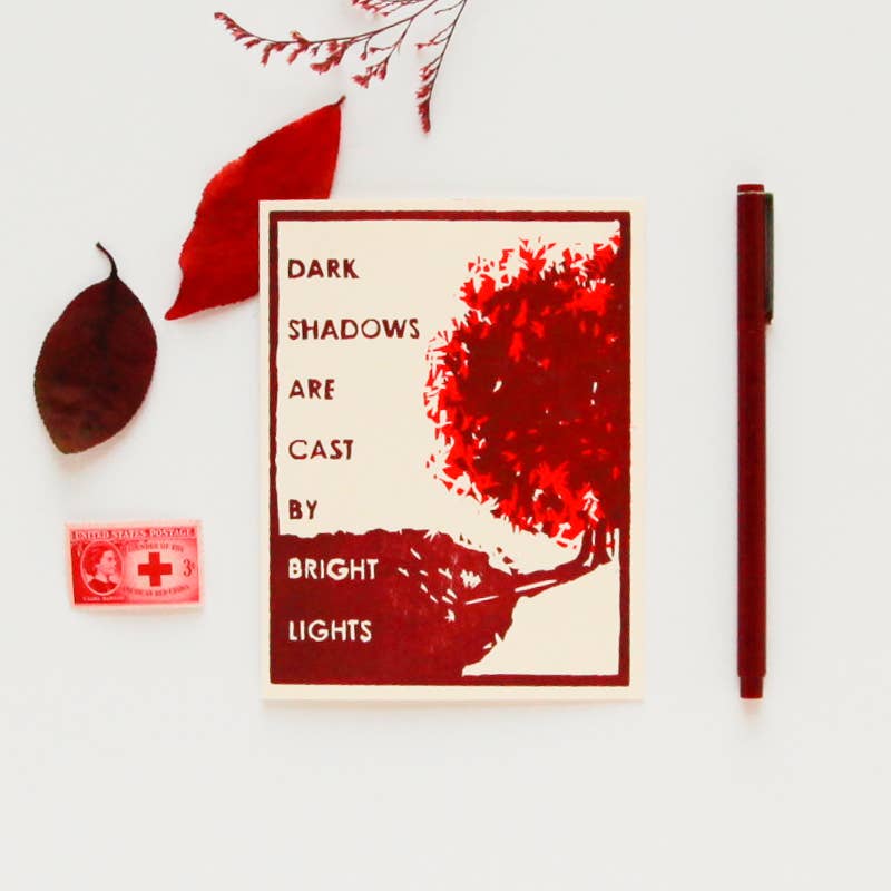 Letterpress, 100% post-consumer recycled paper, A2. Blank inside, cello sleeve with envelope.