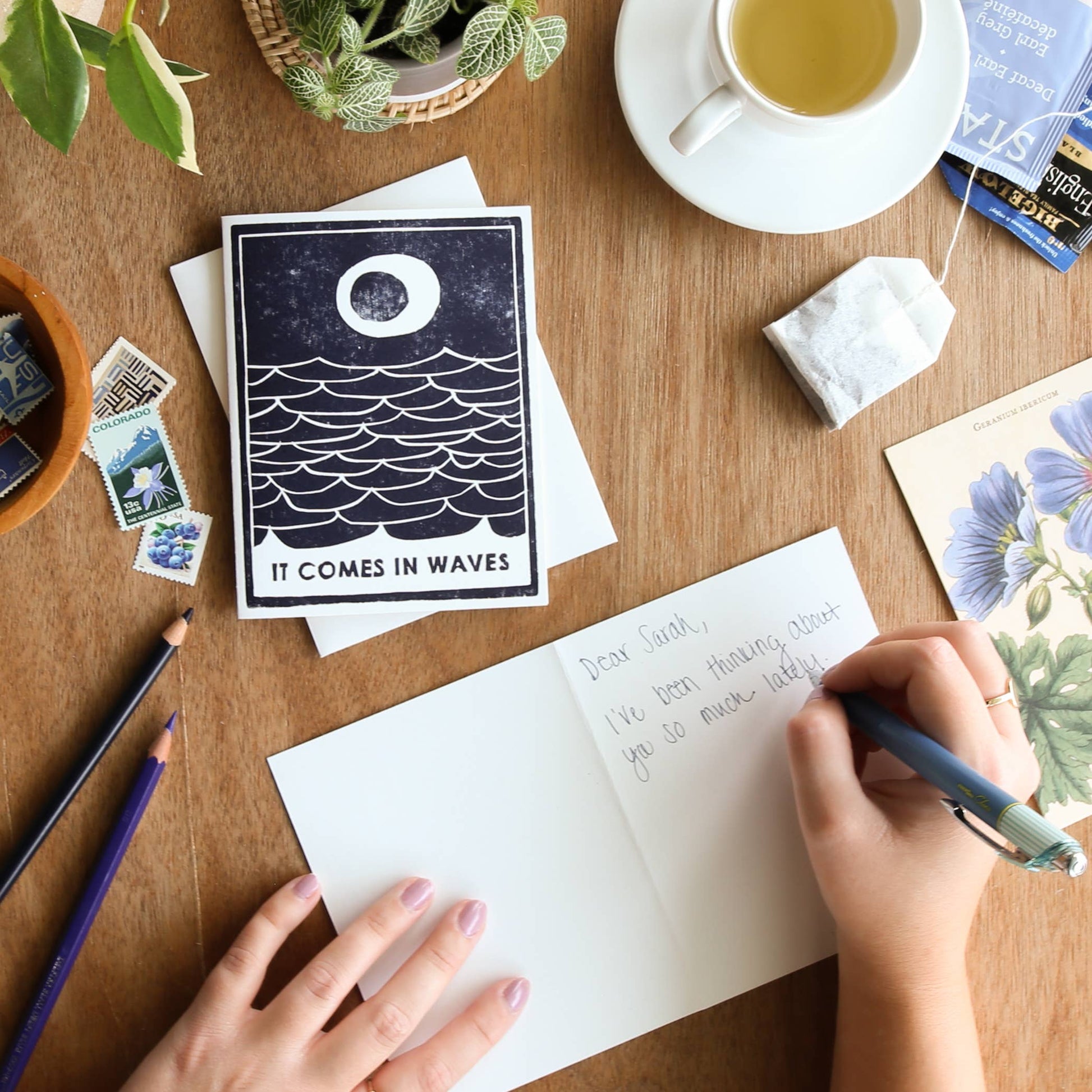 Letterpress, 100% post-consumer recycled paper, A2. Blank inside, cello sleeve with envelope.