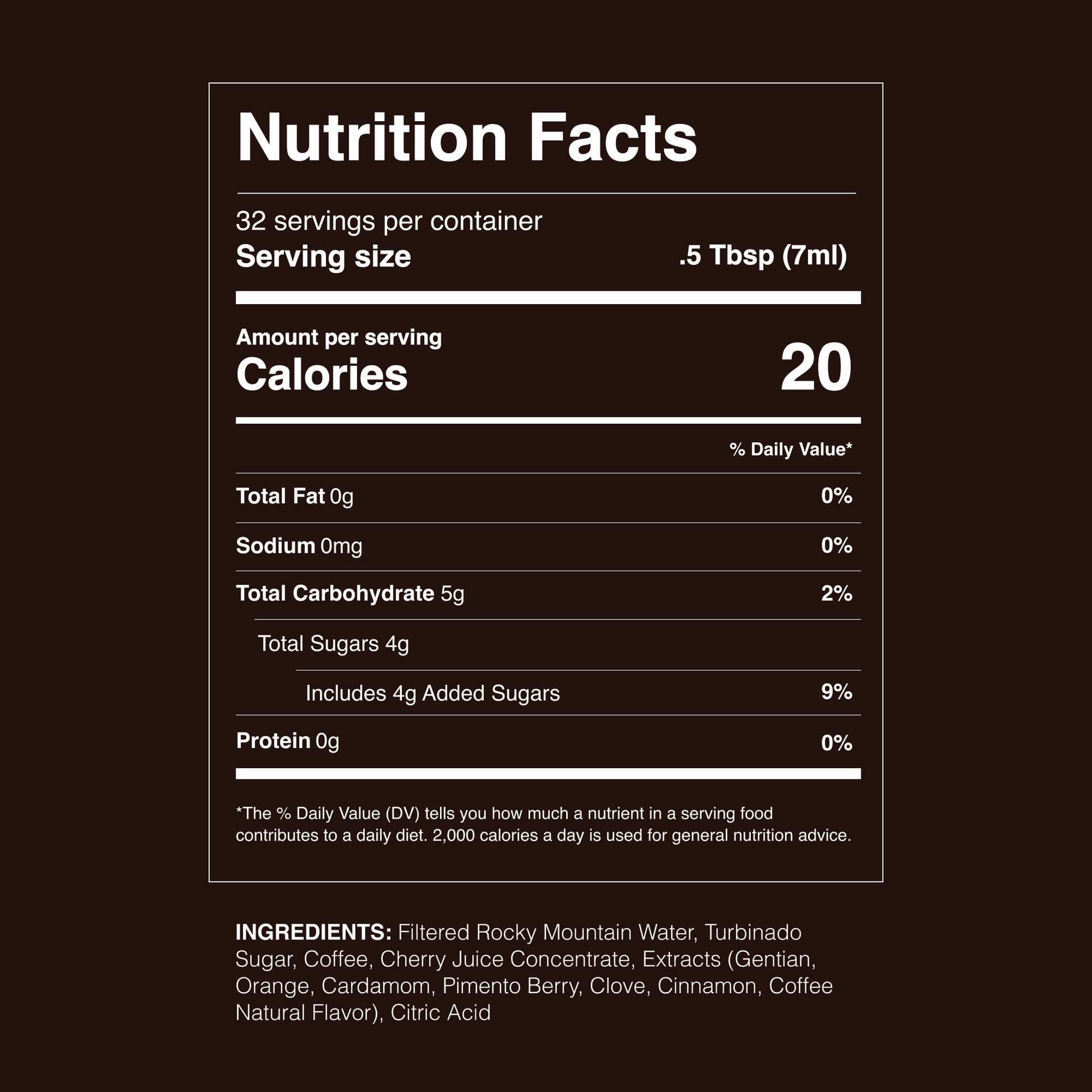 The use of real espresso highlights the caramel notes of organic turbinado sugar, citrus tang of fresh orange peel, and tart sweetness of organic cherries combine in mountain spring water, enlivened by a nutty and complex blend of cinnamon, clove, cardamom, and bitter herbs.