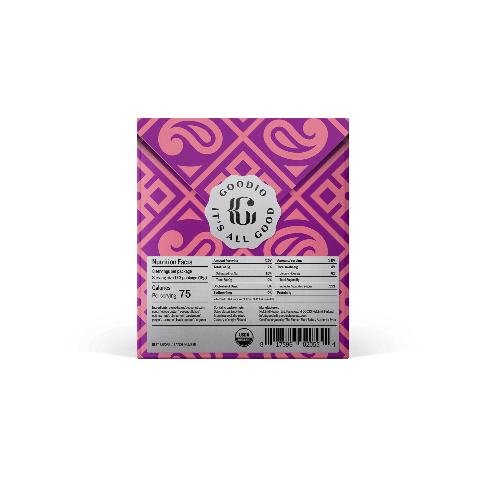 Dairy-free, gluten-free and soy-free. Contains nuts: Cashews. This bar is proudly handmade with love in Finland - the happiest country in the world by Goodio Chocolate Artists. ORGANIC - VEGAN - GLUTEN-FREE Net weight: 1.7 oz.