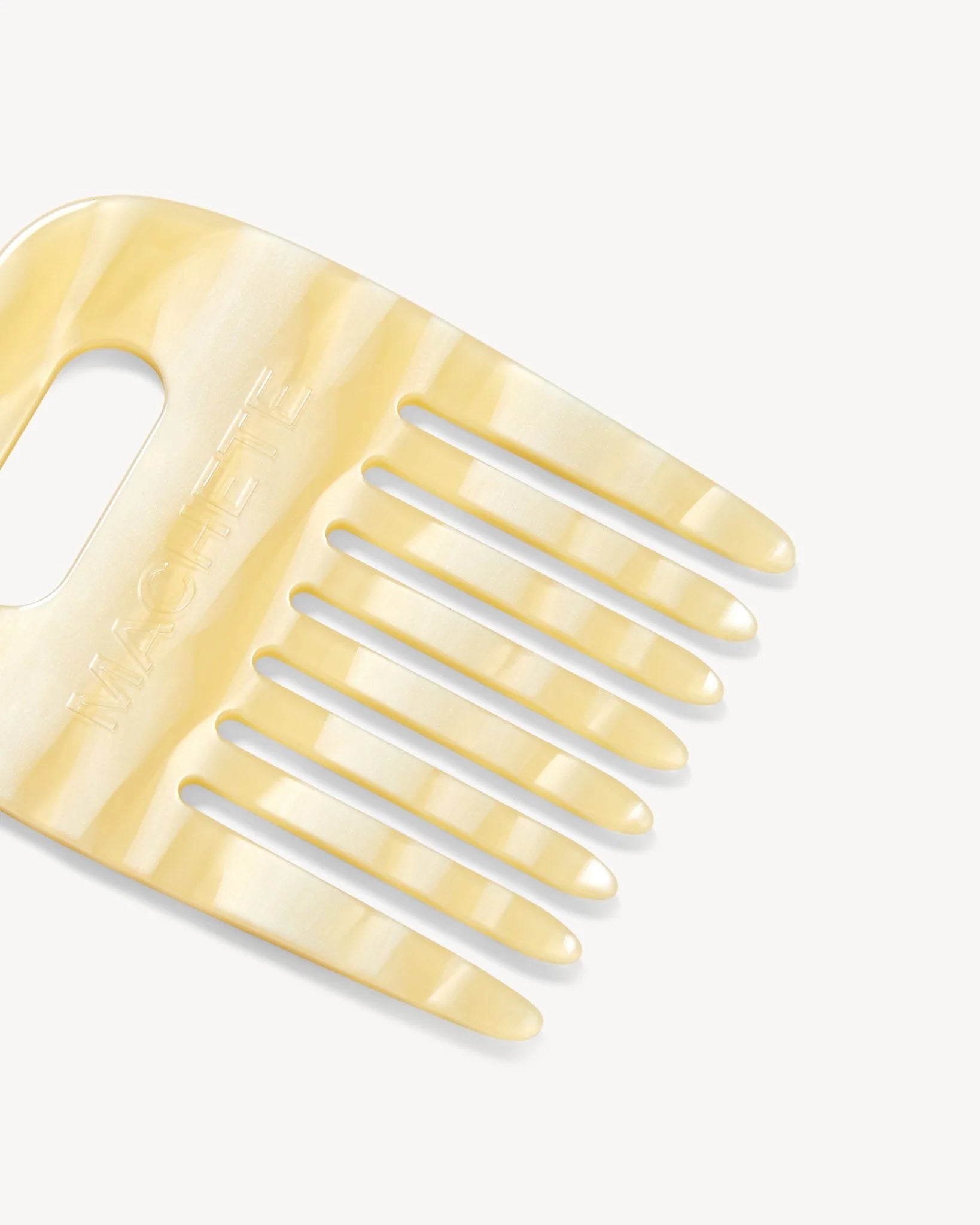 To clean your MACHETE comb, remove all hair and debris from between the teeth and soak in hot, soapy water for ten minutes. Wipe clean and gently pat dry with a towel, then air dry. Weekly cleaning recommended.