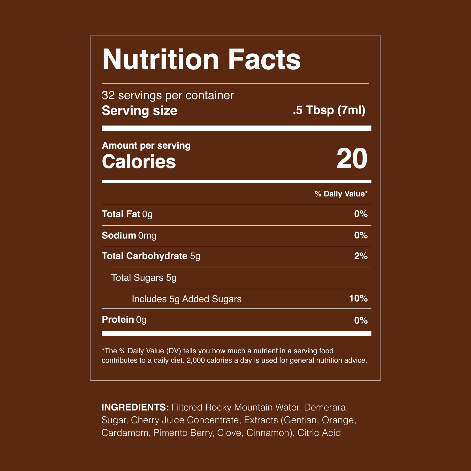 ngredients: Filtered Rocky Monutain water, demeara sugar, cherry juice concentrate, extracts (gentian, cardamom, clove, cinnmon, pimento berry, orange) citric acid.