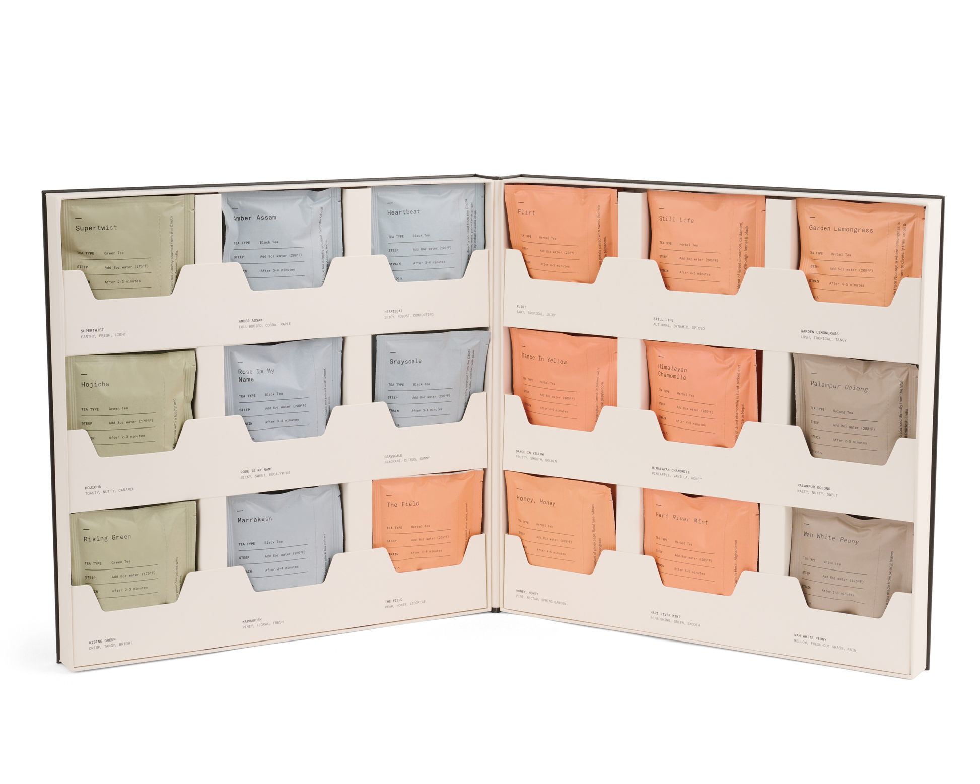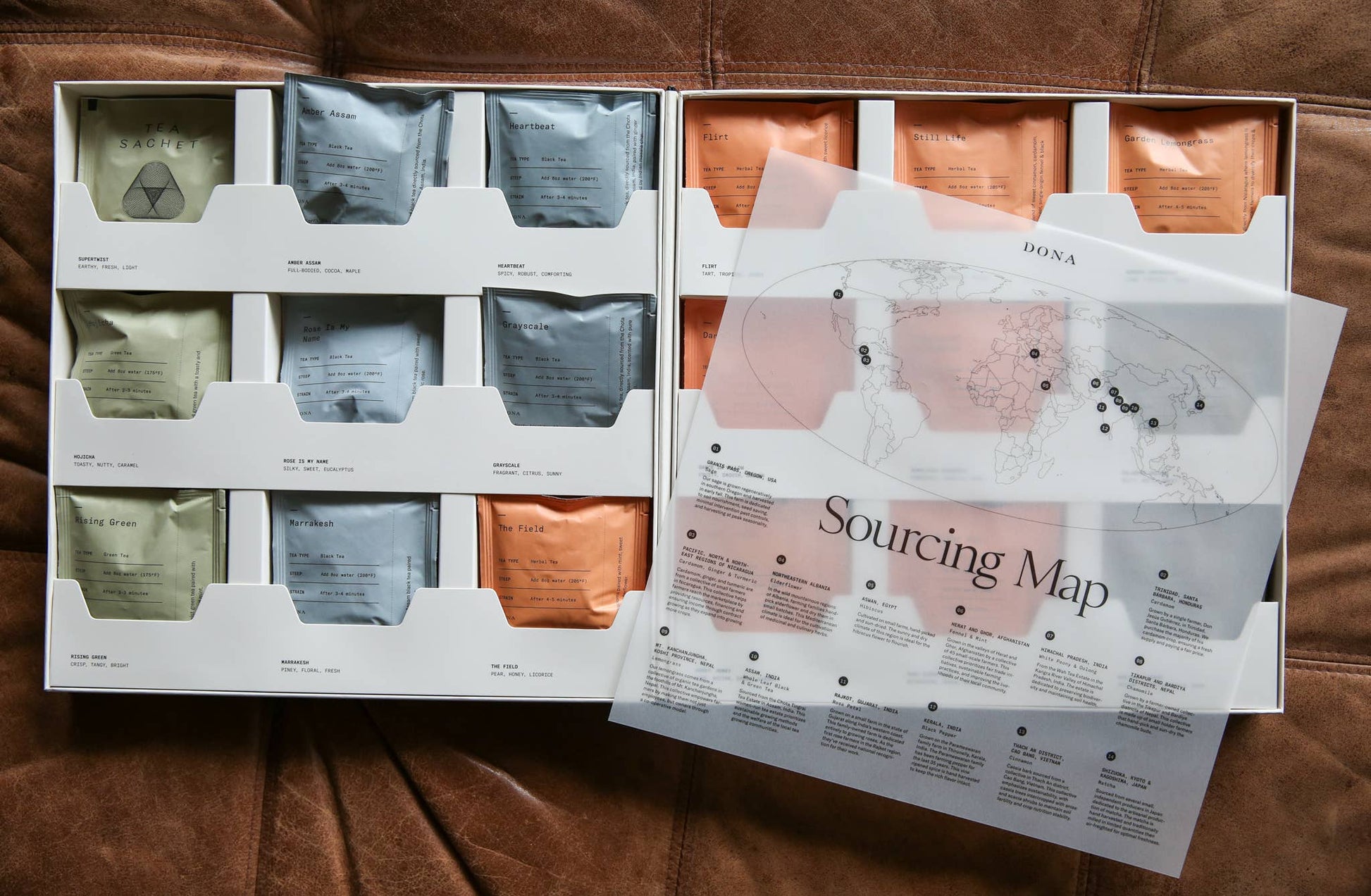 We’re excited to announce the launch of the Dona Tea Library. Each box has 36 sachets: two of each of our entire menu of green, white, oolong, black and herbal teas. Complete with a detailed sourcing map, this project reflects our dedication to complex yet balanced flavors, equitably sourced ingredients, and unparalleled quality. Contains 36 tea sachets.