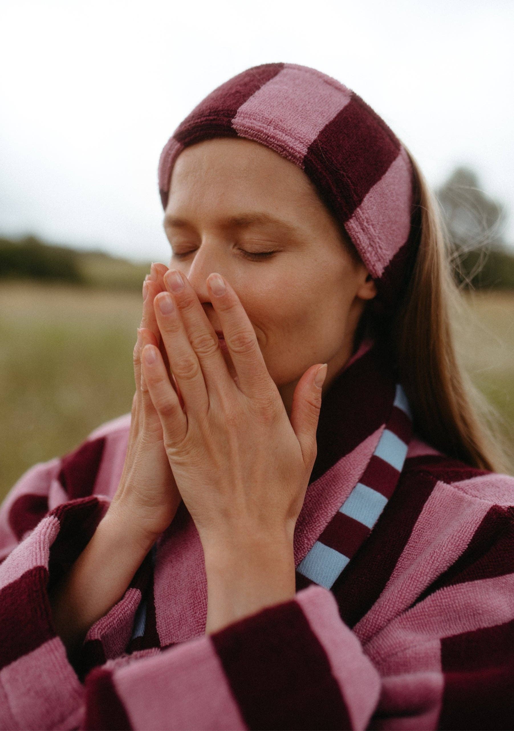Finished in pink and burgundy striped cotton towelling, this hair tie will bring coordination to your post-shower routine. Soft and absorbent, it's made to dry fast and look good.